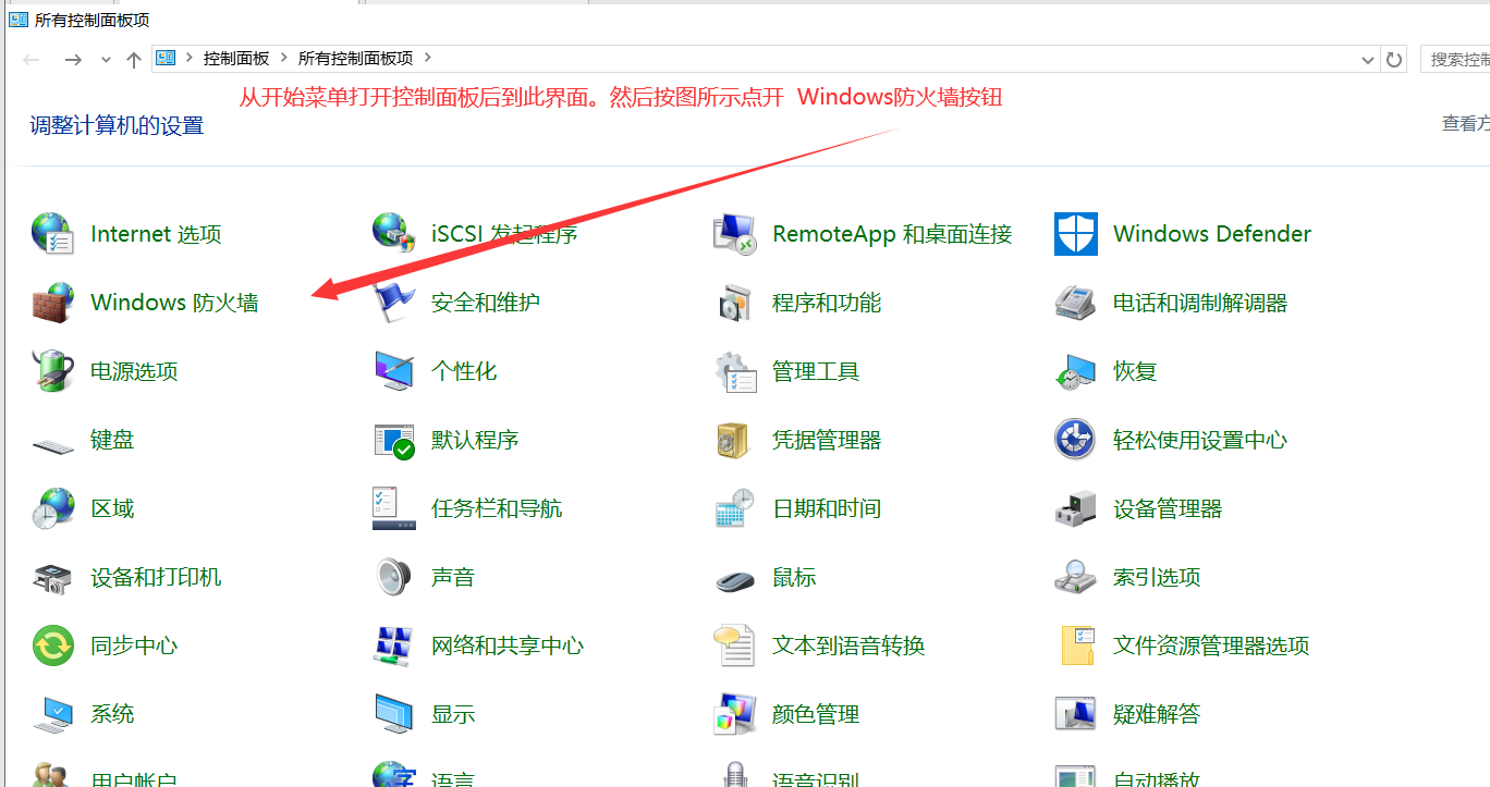 首先在开始菜单栏中打开控制面板并打开防火墙如下图:
